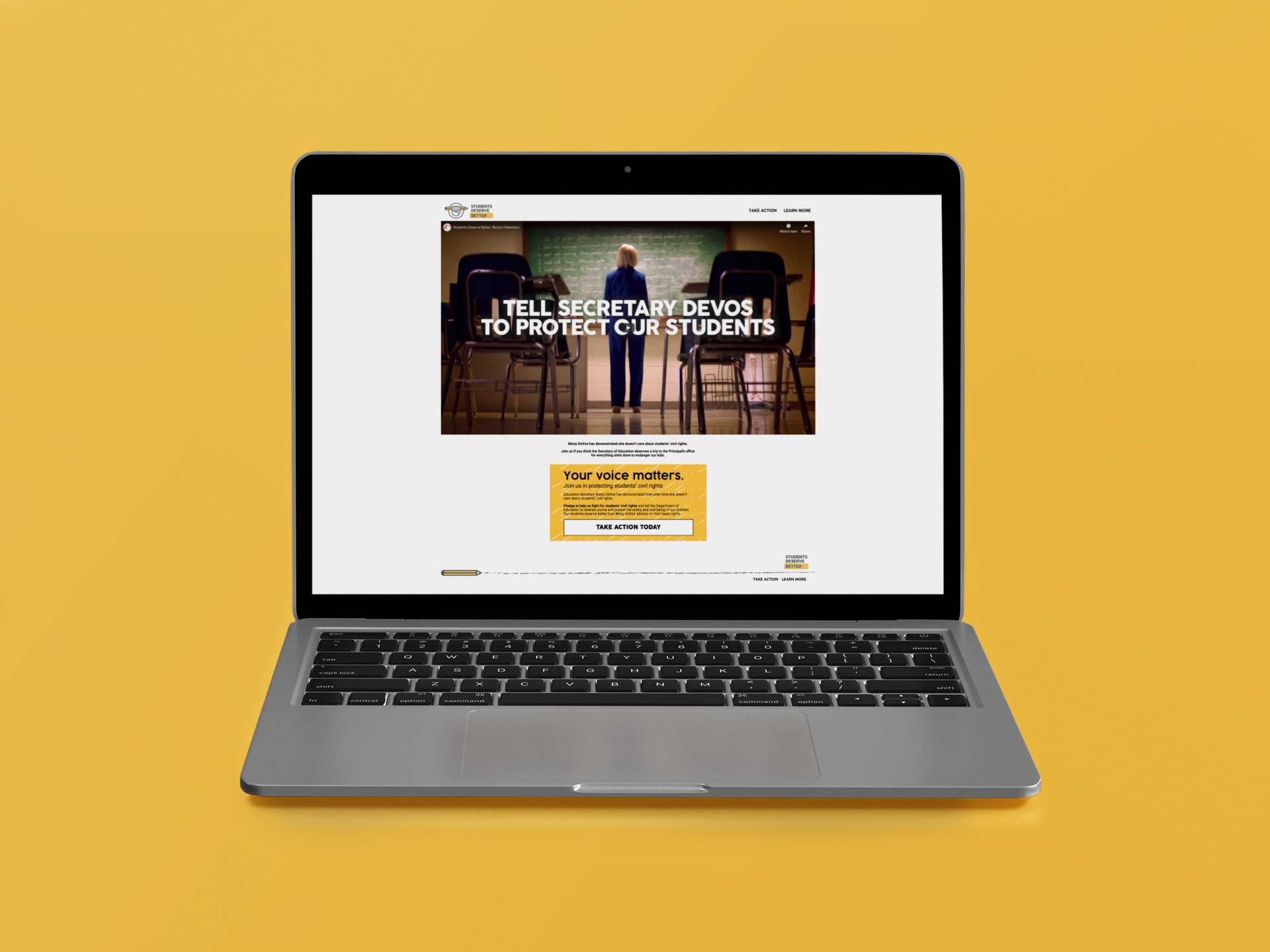 - Students Deserve Better – Two poignant PSAs, one edgy and one sweet, aired during back to school season 2018. They directed parents and allies to a resource site that included ways to advocate for students on a federal, state, and local level. Social ads and IRL advocacy helped to drive participation.