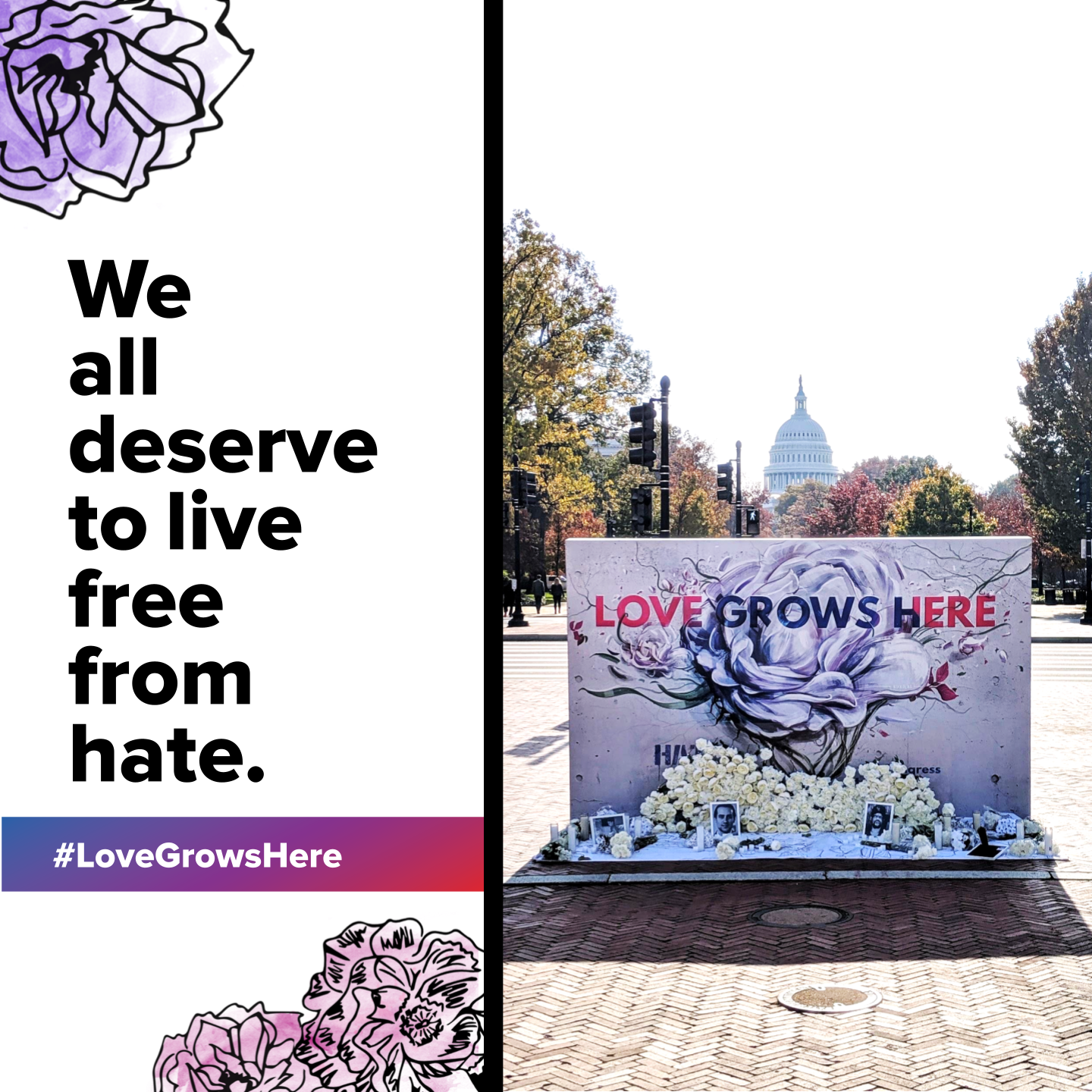 - Love Grows Here – We hosted an event in support of passing the Jabara-Heyer NO HATE Act near the US Capitol and created a suite of supporting content. Our team was uniquely positioned to elevate the families of hate crime victims, amplify our shared message, and help pass critical new hate crime legislation.